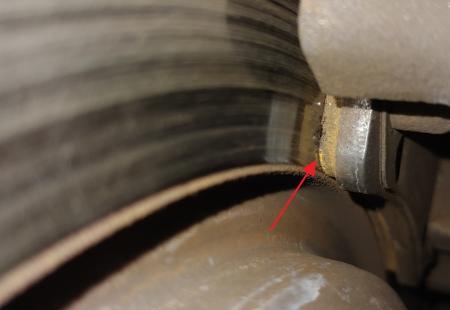 휠 안쪽의 디스크 브레이크의 패드를 육안으로 확인해서 마모 한계선을 넘은 경우 교체가 필요합니다. 타이어 매장을 방문하거나 소모품 교체 시 정비 기사님 통해서 확인해 달라고 하면 육안으로 바로 확인해 주십니다.