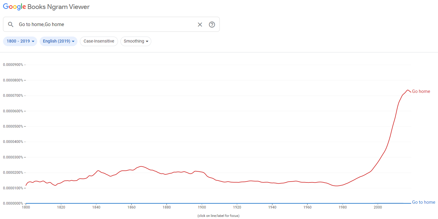 어떤가요? "Go to home"은 완전 바닥에서 기고 있네요. ^^; 처음 사용한 구글 검색은 인터넷에 작성된 단어들을 기반으로 검색하기 때문에 부정확한 정보들 또한 검색하는 데이터베이스에 포함되어 있습니다. 하지만 엔그램 뷰어는 서적에서 사용된 표현들을 데이터베이스로 가지고 있기 때문에, 문법적으로 거의 완벽한 표현들에서 내가 요청한 단어가 검색된 결과를 보여줍니다. 따라서 더 정확한 결과라고 할 수 있습니다.