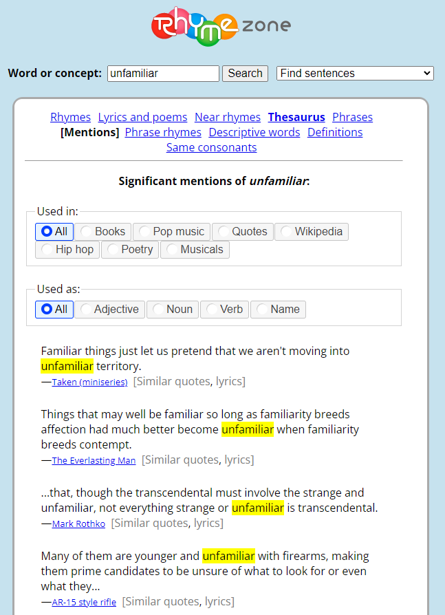 rhymezone.com 이라는 사이트로 페이지가 이동하면서 해당 단어가 사용된 문장들을 검색해 줍니다. 여기서 Used in에 "Books"를 선택하면 다양한 서적에서 사용된 예문들을 확인할 수 있습니다.