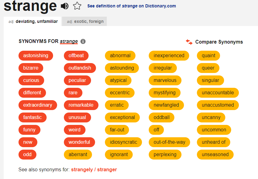 예를 들어 "strange" 이라는 단어는 넣어 보면 유의어를 보여줍니다. 관련된 단어를 클릭해서 타고 타고 들어가면서 찾아보다 보면 시간이 훌쩍 지나갑니다. ^^