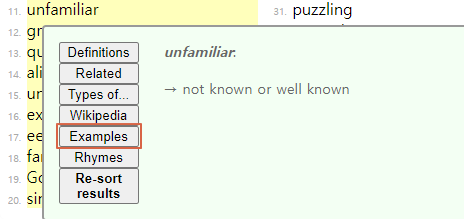 검색 된 단어 중에 unfamiliar라는 단어가 마음에 듭니다. 해당 단어들이 사용된 예문들을 보기 위해 해당 단어를 클릭하고 팝업창에서 "Examples"를 선택합니다.