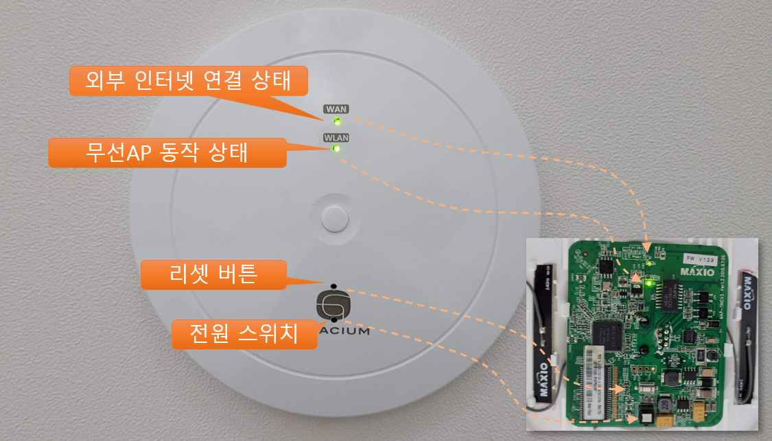 최근에 지은 아파트들은 거실 천장에 무선 AP(Access Point)가 설치되어 있습니다. 저희 집의 경우는 MAXIO사의 MAP-11ACR이 설치되어 있습니다.