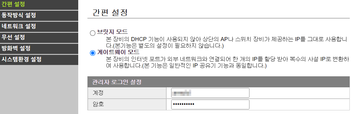 위의 관리자 페이지는 초기화 후에 적용된 값입니다. 저는 무선 AP로 연결할 때 자동으로 IP를 할당받는 일반적인 IP공유기와 동일한 동작하는 하는 모드인 "게이트웨이 모드"를 적용합니다.