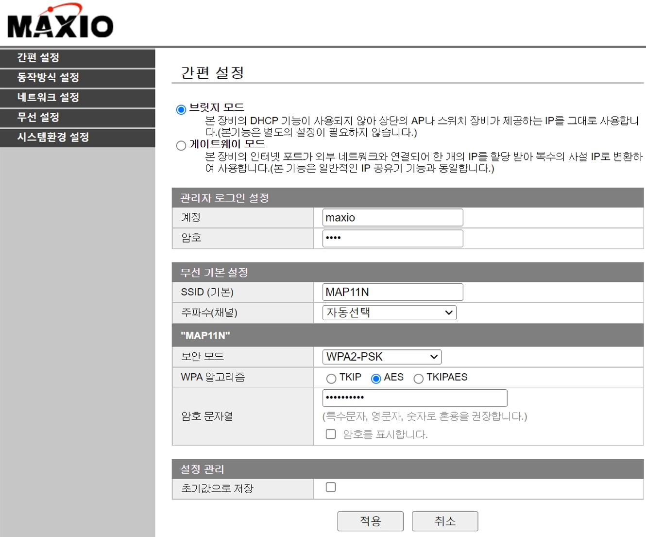 2022.06.08 - [잡학사전/IT] - MAXIO MAP-11ACR 아파트형 무선 AP 초기화 글에서 제품 뒷면의 관리자 ID / 관리자 PW를 확인합니다.