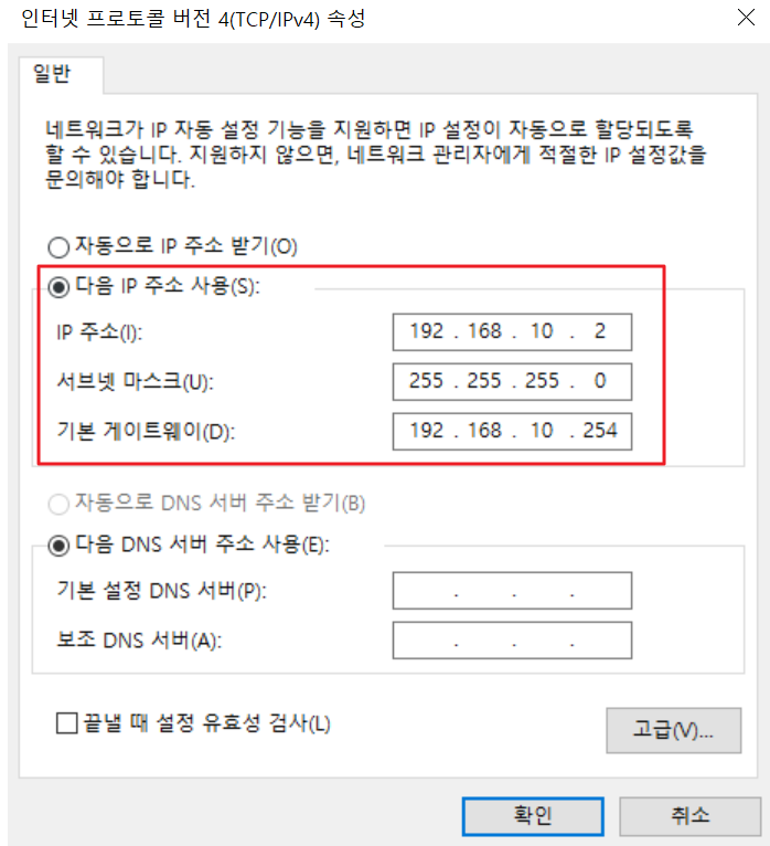 무선AP의 관리자 페이지인 "192.168.10.254"로 접속하기 위해 위와 같이 PC의 IP는 "192.168.10.2"로 설정하고 기본 게이트웨이를 무선 AP의 관리자 페이지인 "192.168.10.254"로 설정합니다. 이렇게 설정하면 PC에서 무선 AP를 통해 외부로 접속되기 전에 기본 게이트웨이로 접속하기 때문에 관리자 페이지로 접속 가능하니다.