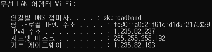 무선AP와 연결된 외부 공유기에서 할당받은 IP가 사용됩니다. 저희 집의 경우 skbroadband를 사용하고 있어서 다음과 같이 IP가 할당됩니다.