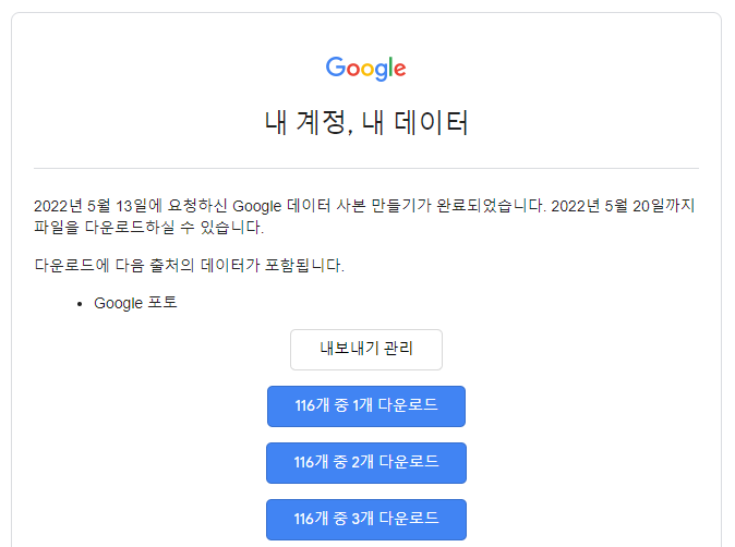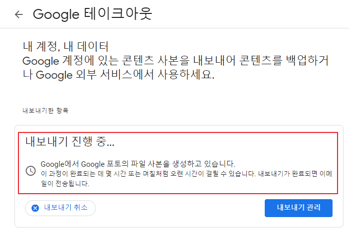 "내보내기 진행 중..." 이라는 메시지가 보이면서 서버에서 열심히 준비하고 있습니다. 구글 서버에서 전송 준비가 완료되면 해당 링크를 메일로 보내주게 됩니다. 창을 닫고 다른 일을 하고 있으면 됩니다. ^^