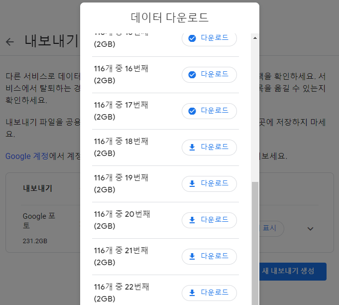 그 동안 쌓인 사진이 어마어마한가 봅니다. 2GB 크기로 총 116개로 나누어져서 링크가 보내졌네요. 각 파란색 링크를 클릭하면 ZIP으로 압축된 파일을 다운로드할 수 있는 페이지로 이동합니다.